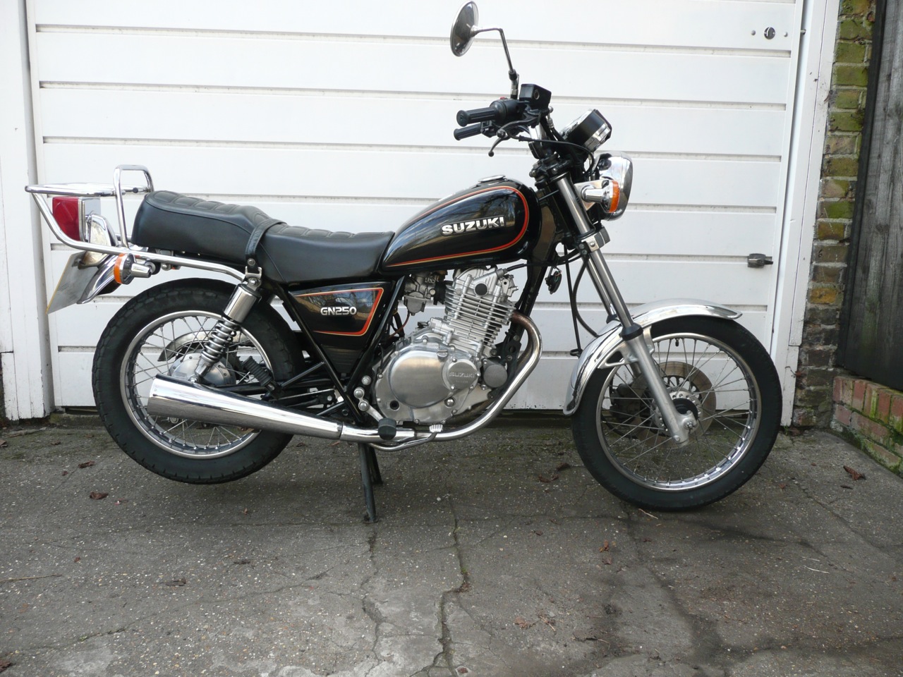 I wrote a little brief for finding the donor bike in the form of a list. It had to be light and manoeuvrable, cheap to buy, run and fix but, most importantly it had to have potential. With only a month of workshop time available I knew I wouldn’t have time for complex frame work or to farm stuff out, I had to do whatever I could myself and quickly. I set myself a budget and dived into the web in search of a likely candidate. I finally settled on Suzuki’s GN250, an oft maligned little commuter custom like a Yamaha SR250, but better looking and with more appropriate geometry. Although they turned up on ebay fairly regularly the prices were high and condition questionable. I tracked a good one down in Gloucester – lady owner, low mileage, big rear rack. Perfect. I took the train down, and rode it home the same day.