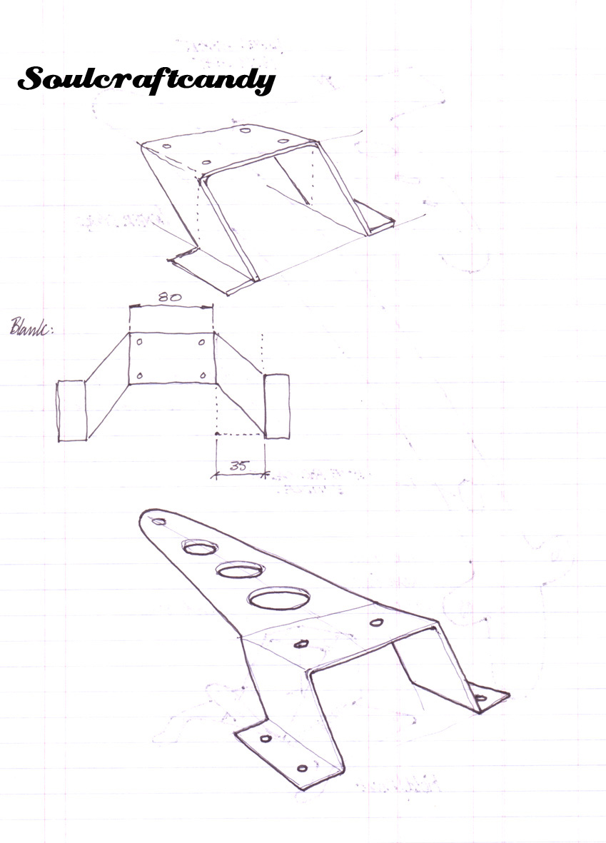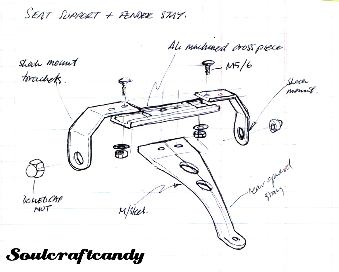 These three sketches above are from my notebook and show my thinking about how I could overcome the stability and strength issues with my rear fender. The top two sketches show a rough idea of the kind of upper support I wanted, a tapering finger of material with some holes pierced in it for a kind of lightweight look. This would be coupled with a large strip of slightly heavier gauge steel than ran down the centre of the underside of the fender piece. This strap would mount at the front end via a hole to match up with that on the mounting plate and at the back end two spaced holes would line up to accept the two mounting bolts passing through the fender from the rear lighting cluster and numberplate mount. Like a kind of backbone to the whole affair. I reckoned this would contribute significantly to the rigidity of the fender piece both in a vertical plane and horizontally. There was still the issue of dealing with any twisting action though. The final sketch is me investigating how to fix the upper mount to the assembly already in place for holding the seat in place.The first thing to do then, was to translate my sketched ideas into three dimensions and see how it worked.