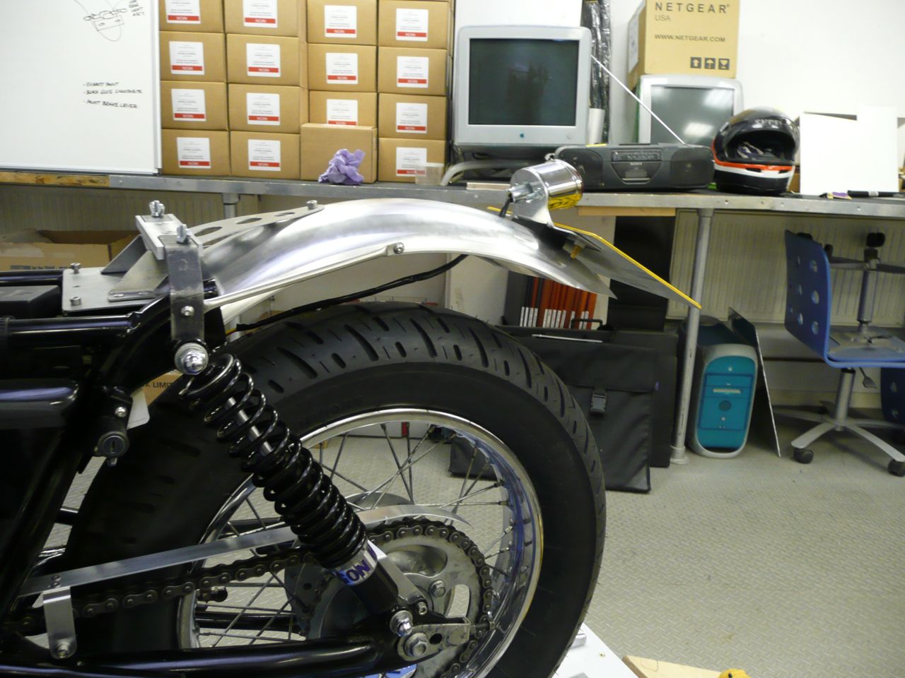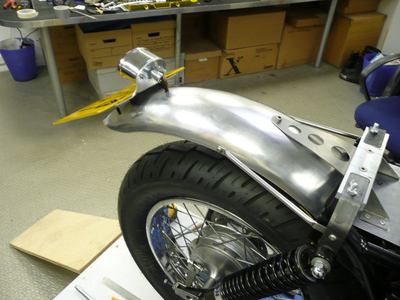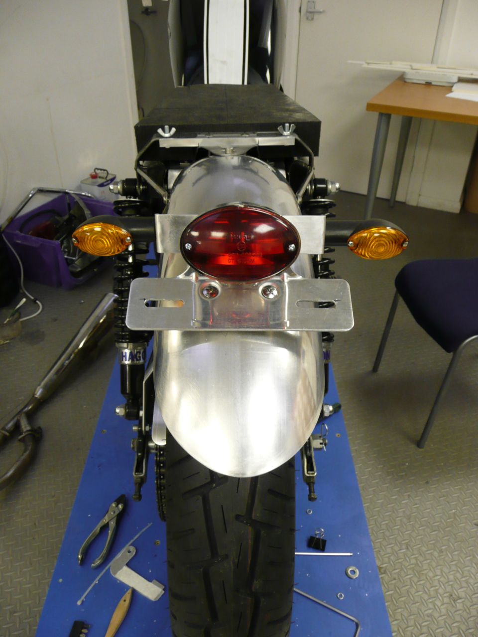 I’d made up the rear lamp assembly in accordance with my build philosophy, this was to be a workhorse bike. So I wanted easy removal of the whole lot if needed, tidy wiring and if the registration plate was integral all the better. I knew I couldn’t have the plate mounted on the side of the bike to keep the back end clean as this would have been asking for trouble in the parking bays of London, so on the rear fender it had to go. I’d cut and bent a short length of flat aluminium, drilled appropriate holes and created an assembly which could be mounted and removed as one piece.