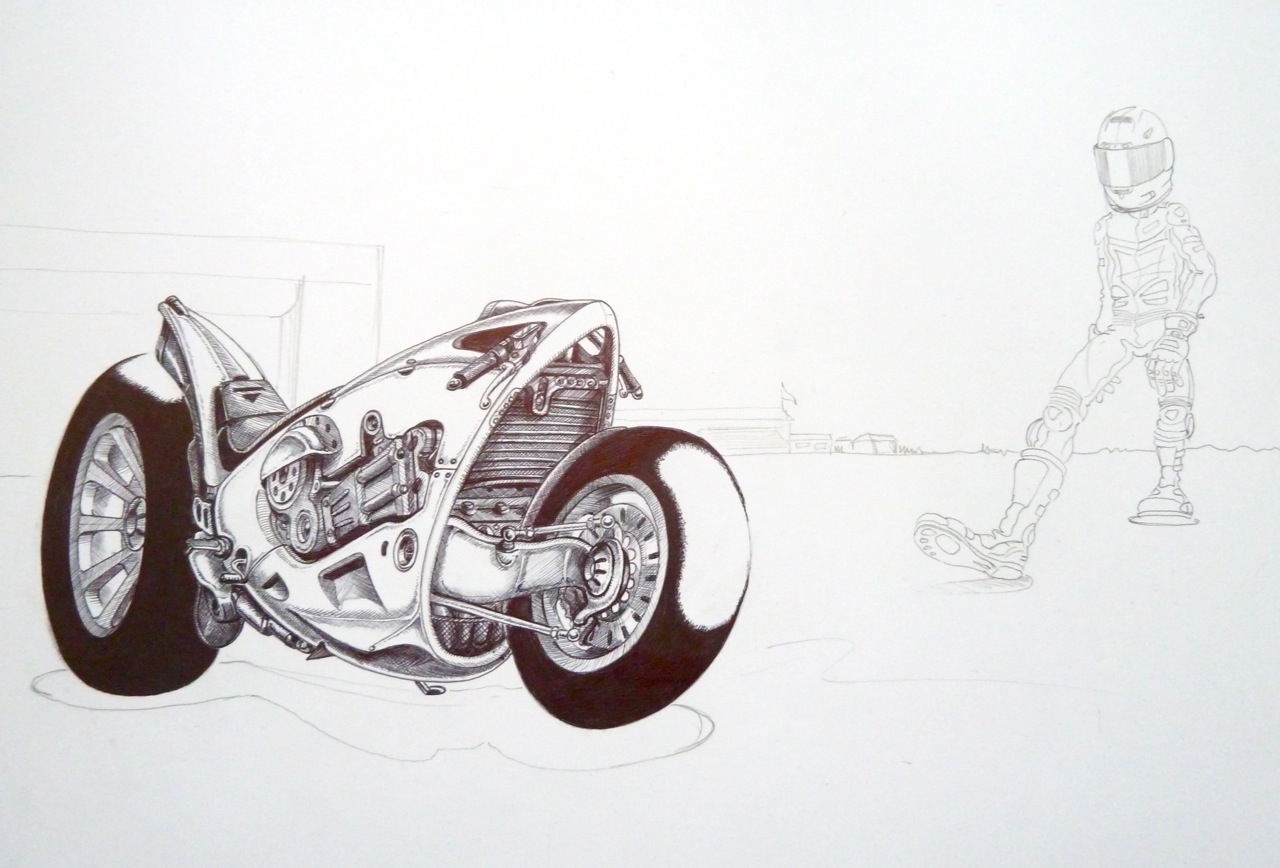 This drawing continues with one of my current themes which is playing with chassis forms which are enclosed or wrapped. Granted it doesn’t allow as much detail to come through from the engine but, this is not an issue frankly. It gives the bikes a cohesive form factor which pleases me greatly. By keeping bodywork shading to a minimum the aim was to get the eye to focus on the stark contrasts that run from right to left. I hope you like it.