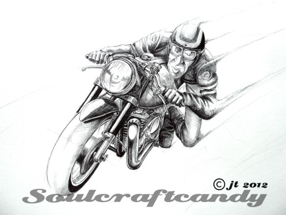 The latest visit has yielded the above drawing which has been sitting rather unloved in a large pad that spends most of its time being moved around to make room for other things. Such is the way of small rooms and large flat things. Anyway, it has sat there patiently waiting for its moment of glory, inclusion in a post in it’s final form. It’s called Street Racing No.2, following on from a previous drawing, done in a style I rather casually refer to as scribbling. It needed finishing off. Drawn pretty much directly onto the page over a very vague pencil layout, this technique involves a very light touch with the pen, working around the image in a very sketchy and indeterminate way. It builds the picture very slowly and is without a doubt very time consuming. This is one of those methods that really tests your resolve to finish the piece, to persevere and get to the end knowing you’ve chosen this path yourself. Yes I know this is a relatively small drawing, but it does provide an insight into what working at a much larger scale involves in terms of focus and momentum.