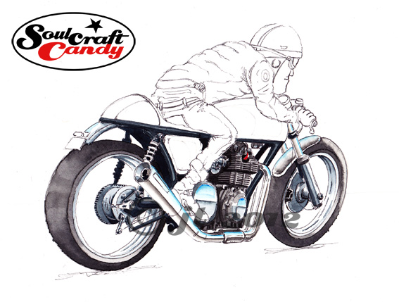 The third version of this sketch is now complete as far as the main subject of the image is concerned. So as not to reduce the exercise to one of exact and complete copying I elected to change a couple of features about the central picture in an effort to try rendering certain details differently as much as to maintain my interest in it. So you’ll see that this time the main body of the engine is made to look black, the bike has taken on a two tone colour scheme and the rider figure has taken to wearing a check shirt amongst other small changes.