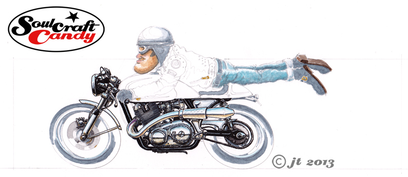 This second wash stage involves getting the rider figure underway and laying the base colour pieces to the wheels as well as getting that tricky curving exhaust sorted out. As with the frame I put grey on the wheels and tyres in the places where I know I’ll leave gaps in the black of the ink, and apply this same method to parts of the rider like boots, helmet parts and goggles. Now, a quick word about that exhaust. Back when all of us budding designers were drilled in the fine art of marker rendering, it was obvious after a while that the practice involved learning a few, what I would call, conventions. Little techniques for doing curved surfaces, metal parts, areas of high gloss, textures and chrome amongst others. Although I haven’t picked up a marker in years, some of them remain useful when dabbling in other media. Shiny exhaust pipes are a case in point. A grey line to denote a horizon below which a brown area denotes ground reflections, and finally a blue upper area to signify the sky. Simple and effective, with some extra colour tones around the cylinder head exit where the metal changes colour due to the heat.