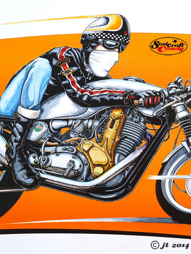 As for that background, well it just needed something massive and punchy to lift it off the paper and grab the eyeballs. I did it in Dr. Martin’s liquid water colour with an airbrush, using two variations on orange. First a layer of orange and then some tangerine layed over the top. I always find using the airbrush completely nerve wracking. Laying down the masking film is enough to give me the jitters on its own, and then cutting out the mask with a scalpel and removing the pieces turns me into a shaking wreck! Spraying seems to be the easy bit. The ink takes ages to dry properly and in the end I had to remove it from the surface of the film with a carefully placed piece of blotting paper and a roller. Only then is it safe to remove the mask, very, very slowly.