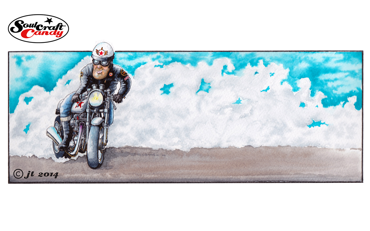 This last one is a slightly different animal, an image on which I’m trying to do something new (for me anyway). Firstly I’m trying to paint much more of a complete scene and this is forcing me to think harder about background, middle ground and foreground and the focal relationships between them. In all honesty I’m finding it quite difficult, but it’s rewarding to try and rise to the challenge. My difficulty probably stems from all those years of design drawing where one is not expected to create any sense of depth of field, presentation visuals being very two dimensional in nature, and so it all feels a bit alien and intimidating. So in order to help myself as much as possible I’ve divided the image into three planes, big bike at the front in focus, two smaller bikes on the second level and then the landscape on the third, mainly. The desire to try a bit of freer brush work, which I’ve mentioned before, now gets a chance to play on the background levels and will hopefully minimise my chances of making a muck of it all from the outset and build some much needed confidence in being a bit more loose with how I apply paint to the paper. I’ll keep you posted on progress.