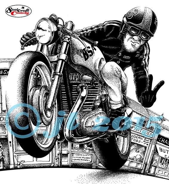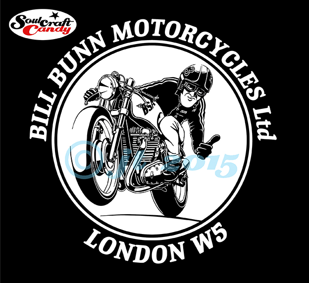 Bill Bunn Motorcycles, a small family business, has been in existence for about 50 years and is the epitome of what your local bike shop should be; compact, friendly and happy to handle everything from an engine rebuild to changing your oil. The guys there are always helpful, good humoured and armed with years of hard won wisdom and experience to help you keep your machine(s) on the road. They are a top team and deserve to stay in business for many years to come. Fortuitously, for me at least, it turns out that they are fans of my work, having found it via the blog last year sometime. A resulting chat, enjoyed whilst dropping the little Suzuki off for a new tyre fitting, revealed that they’re refreshing the store this year, sprucing it up a bit with fresh paint and a general sort out. So, along with some lovely old photographs they have, the guys wanted to hang some prints of my cartoons on the walls too. One should never pass up this kind of opportunity and I’ve supplied some framed prints to them with some prices if anyone might want to purchase one. They also asked about perhaps doing a design for a t-shirt based on one of the drawings so that they could get some shop shirts printed up. I said yes.