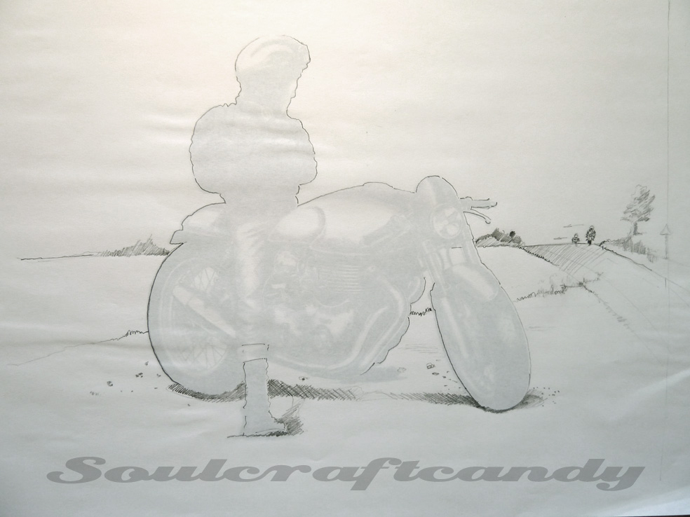 When the central characters and bikes are stationary in a drawing it’s interesting to note that my mind’s eye considers and composes completely different approaches to the contextual background, or what goes in to help place the image on the page. This is almost a subconscious act. When things are in motion, my imagination automatically starts thinking very graphically, with lines and blocks as a way of emphasising that motion. When things are stationary quite the opposite occurs, with visions of horizons and landscapes being the main focus. Not a bad situation to be in, a fertile imagination is a great thing but, it does lead to quite different feeling final outcomes. Somewhere along the line it would probably be worth trying to swap these two traits around to see what comes out but, for the purposes of not wanting to create too many distractions before this series is finished I’ll leave that for now.