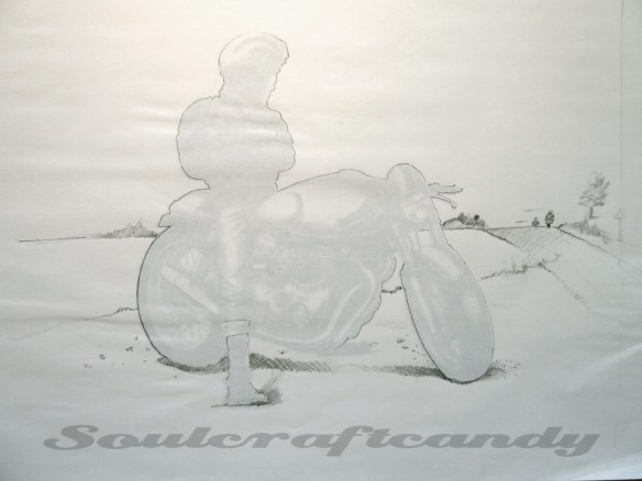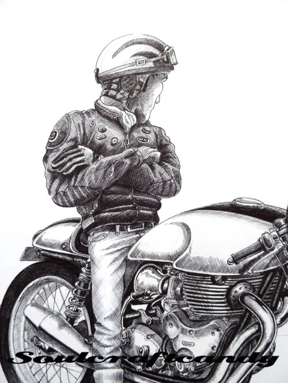 Finally, finally, finally the wind has been in the right direction and the third of the Cafe Racer series is now done. Boy, did this one suffer an awkward and time consuming birth! After all of the misgivings expressed in the previous post about teetering along the line between reality and caricature, it took a bit of effort to apply the finishing touches. There was no way that I was going to be able to drag it back towards cartoon humour, so the best thing to do was just focus on what would suit the central image and concentrate on that. Needless to say, I think it’s turned out not too badly considering the hand wringing of the last few days.