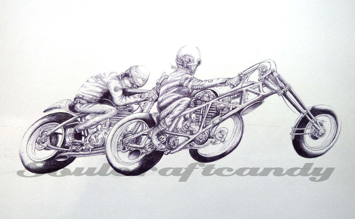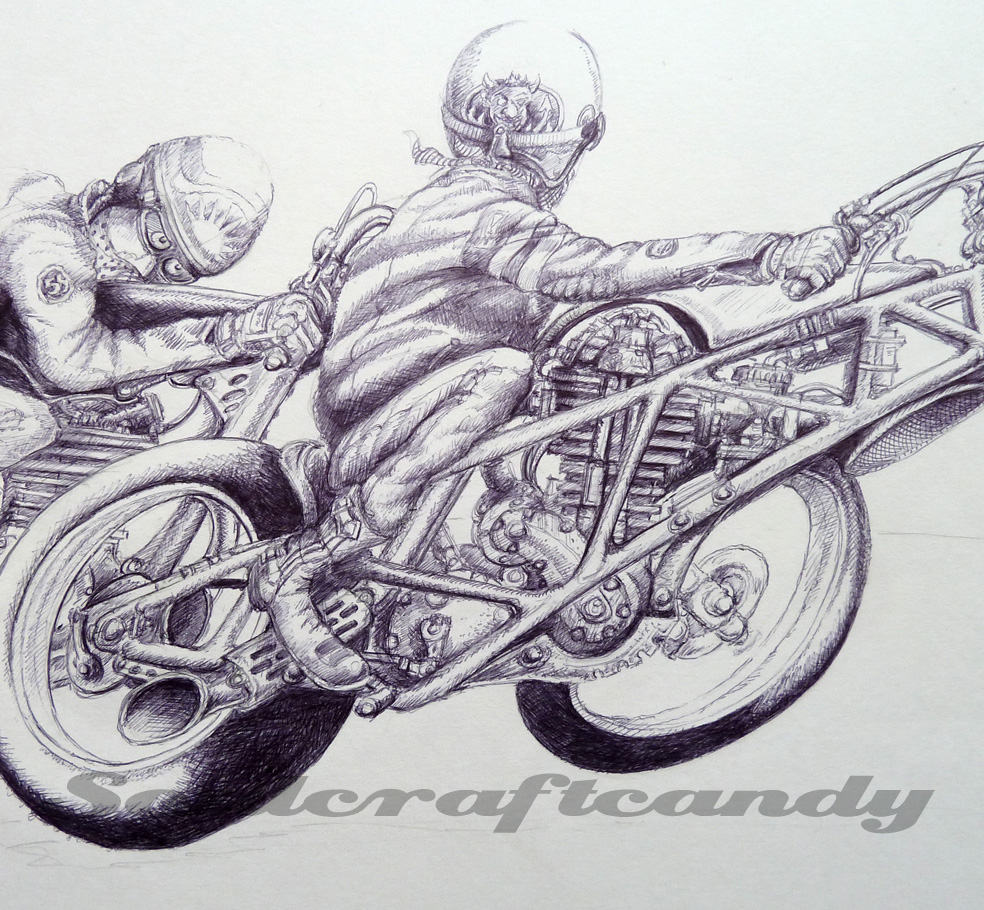 Back in early January, post No. 50 featured the finished version of the first of what have become known as the “Scribble” drawings. It depicted two guys vying for the lead in an impromptu street race somewhere out in the middle of nowhere on an empty road.