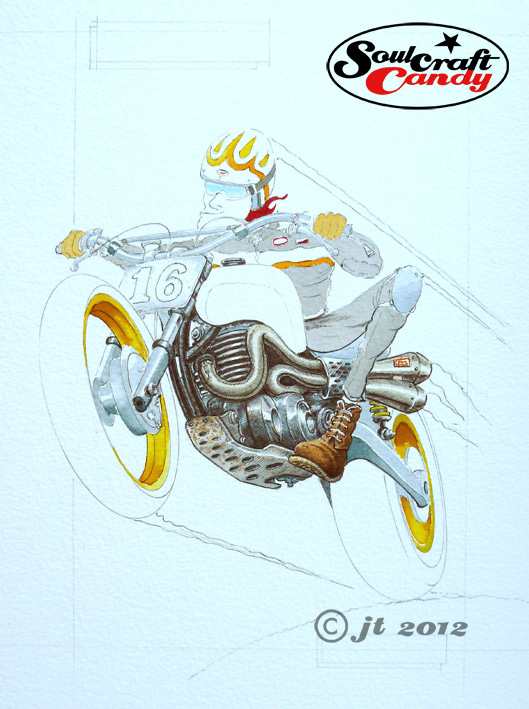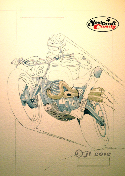 In the absence of a more detailed brief I decided that I would go forward with a combination of ideas. Firstly I picked two rather obvious ideas based firmly on a girl riding a bike, and then chose a couple of others based around a more emblematic approach. Each one was worked up as an inked drawing to start with, and done as neatly as I could manage. The girls on the bikes were reasonably straight forward to do in a general sense though I was really conscious of introducing something to try and bring some increased movement to the images. I’m not a fan of using speed lines and blurring to do this, my drawing style doesn’t work that well with them, so elected to simply try and show movement by trying to mimic hair blowing in the wind. The second two choices came from trying to approach them more like logos than pictures and incorporating some recognisable cues from the cafe racer scene like chequer pattern and jacket decoration.